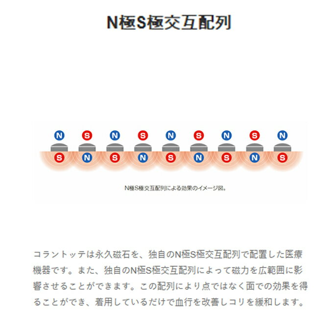 独自のN極S極交互配列で磁力が広範囲に影響し、首・肩の血行を改善、筋肉のコリを緩和します。